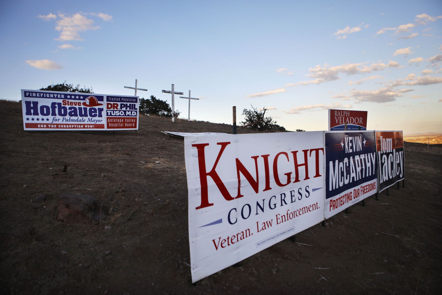 Campaign signs sit on a hillside near Palmdale, California, on Oct 21, 2018. Democrats are targeting seven congressional seats in California, currently held by Republicans.