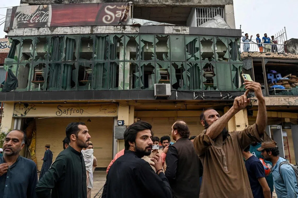 People gathering in front of a damaged restaurant outside the Rawalpindi cricket stadium in Pakistan's Punjab province after an alleged drone was shot down on May 8.