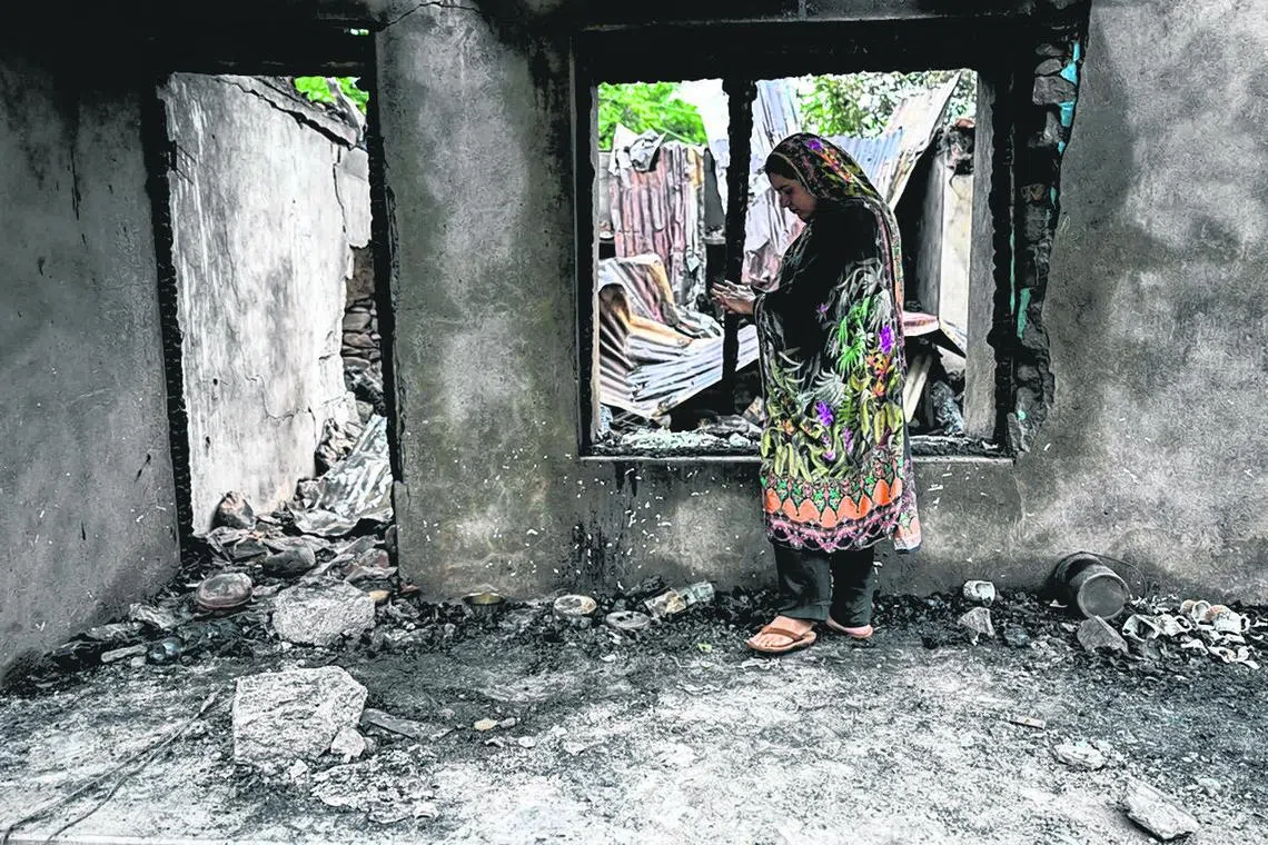 A woman stands outside her house destroyed by Pakistani artillery shelling at the Salamabad village in Uri, about 110kms from Srinagar, on May 8.