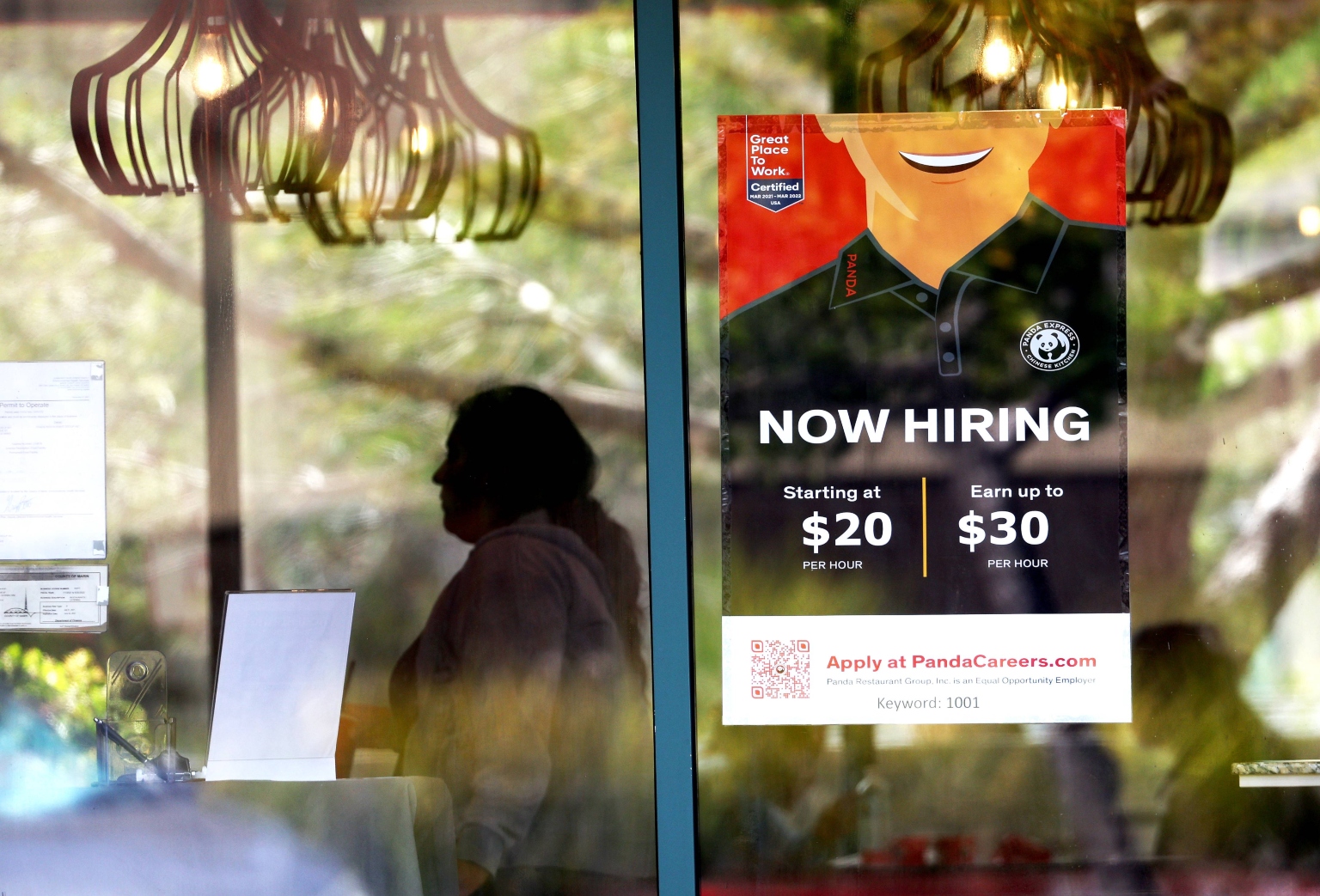 A hiring sign posted at a Panda Express restaurant in California on Aug 5, 2022.