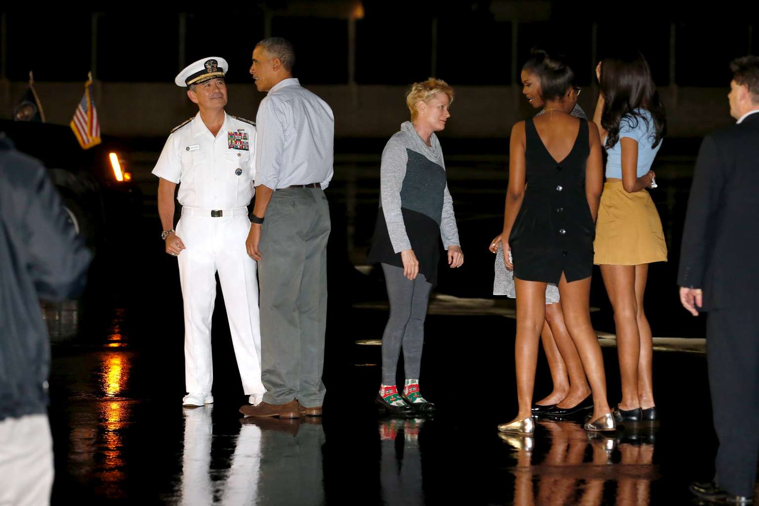 Obama and his family are greeted by US Navy Admiral Harry Harris (left) and his wife Bruni Bradley (third left).