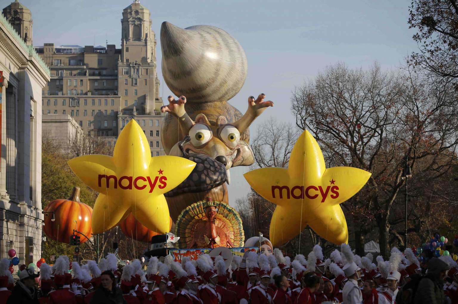 Floats gather on Central Park West prior to start of the 89th Macy's Thanksgiving Day Parade.