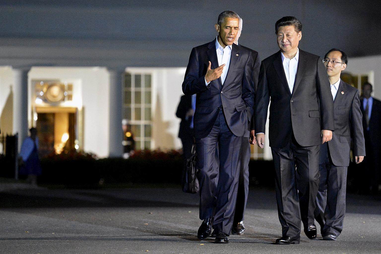 US President Barack Obama (left) chats with Chinese President Xi Jinping as they walk from the West Wing of the White House to a private dinner across the street on Sept 24, 2015.