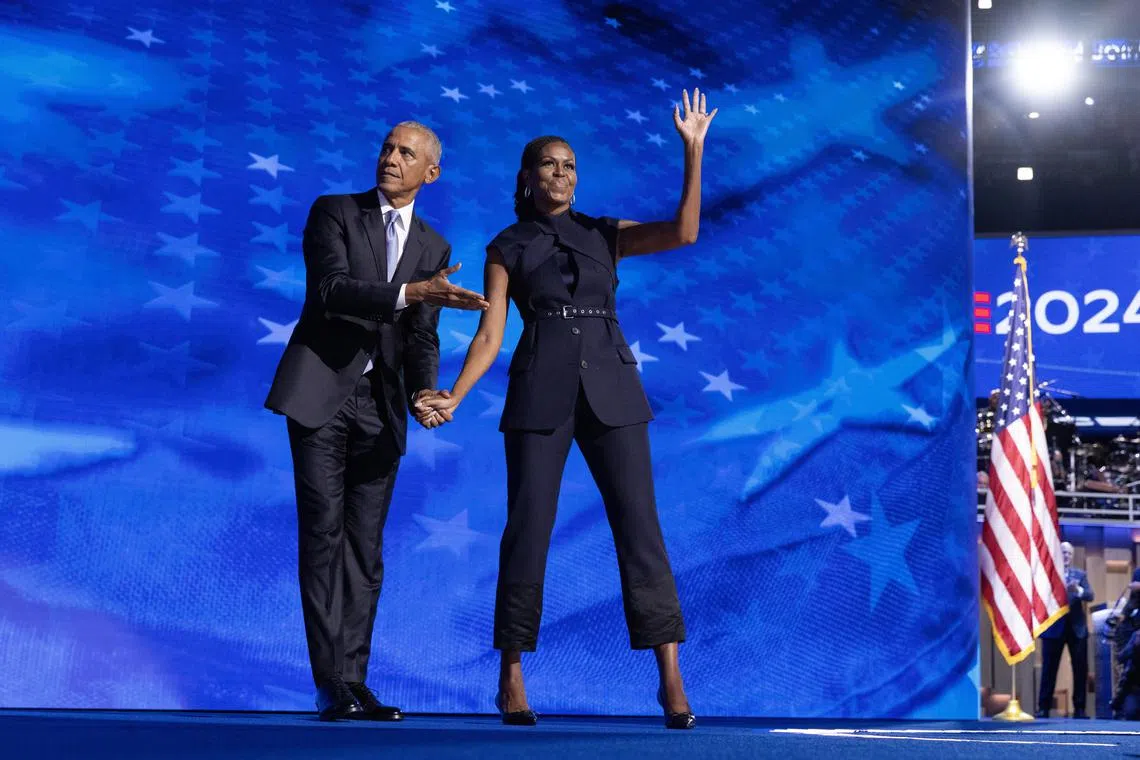 CHICAGO – The Democratic Party’s golden couple propelled the nascent presidential bid of Ms Kamala Harris into orbit by strongly endorsing the US Vice-President at the Democratic convention in the Windy City.