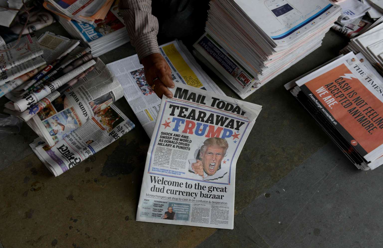 An Indian Newspaper vendor arranging newspapers featuring Donald Trump's victory in the US presidential elections on their front pages, in New Delhi, on Nov 10, 2016.
