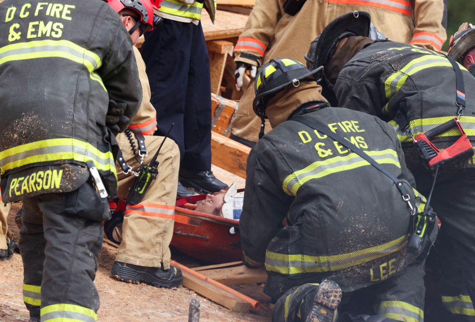 Emergency personnel prepare to transport a construction worker on a stretcher from atop a collapsed building.