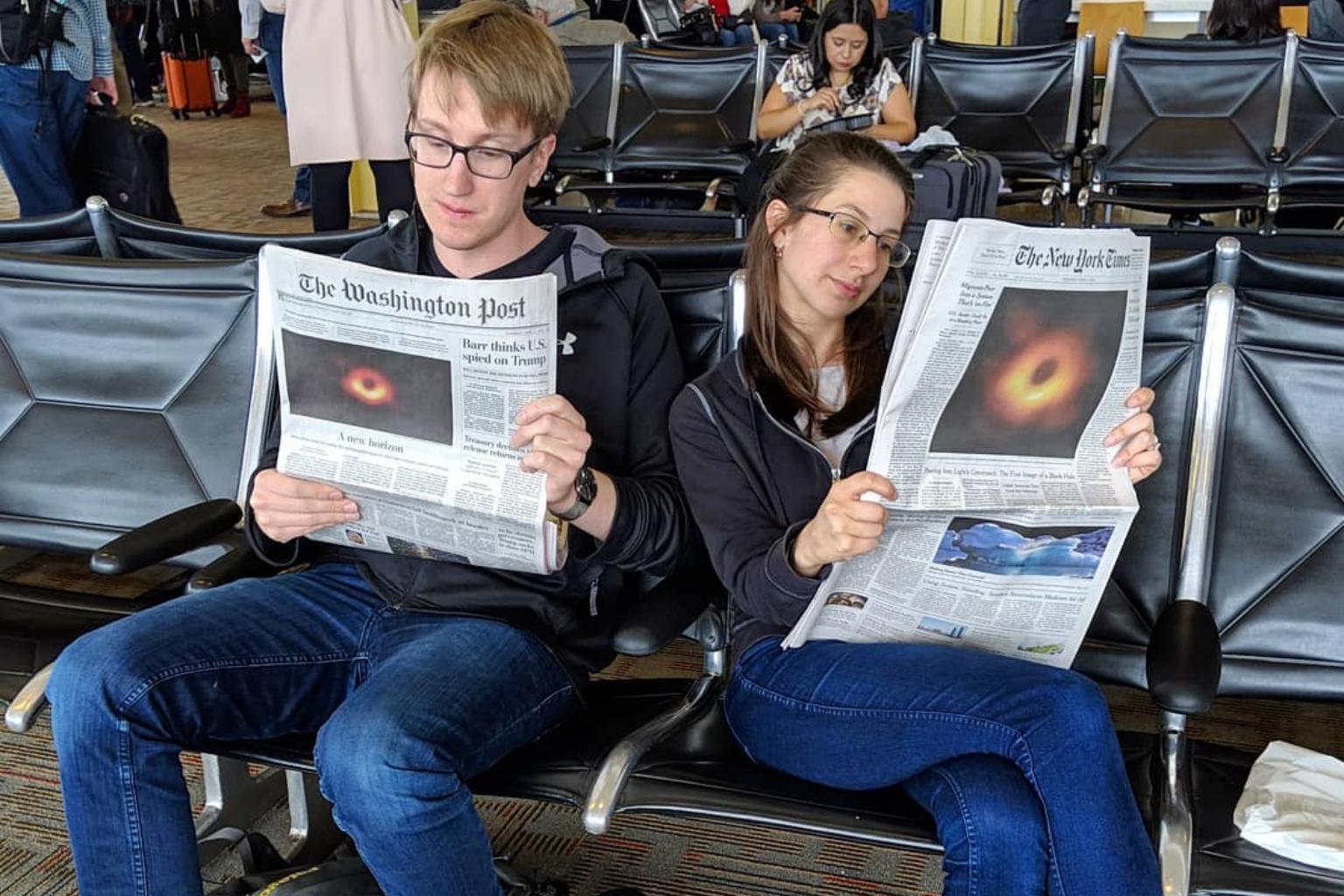 Dr Katherine Bouman, a postdoctoral researcher who developed an algorithm that was key to capturing the image of a black hole, with Mr Andrew Chael, another member of the Event Horizon Telescope team.