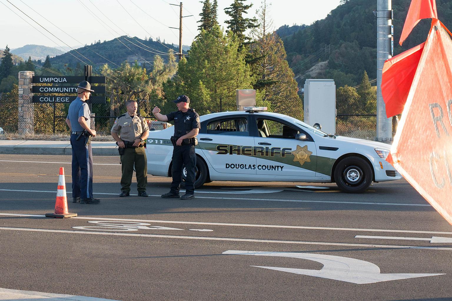 A police car blocking a road in Roseberg, Oregon, on Oct 1, 2015, after a gunman went on a shooting rampage earlier in the day.