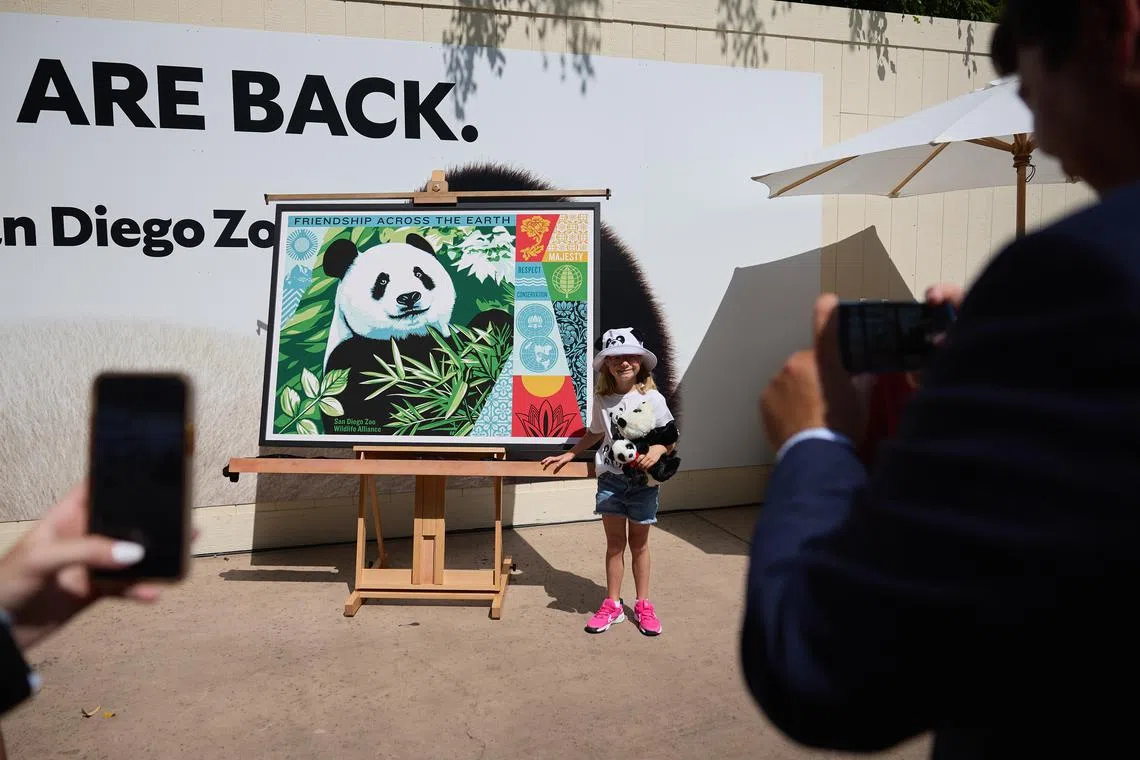 A girl poses with artist Shepard Fairey’s portrait of Bai Yun, the maternal grandmother of Yun Chuan, which was unveiled at the ceremony to introduce the new giant pandas at San Diego Zoo.