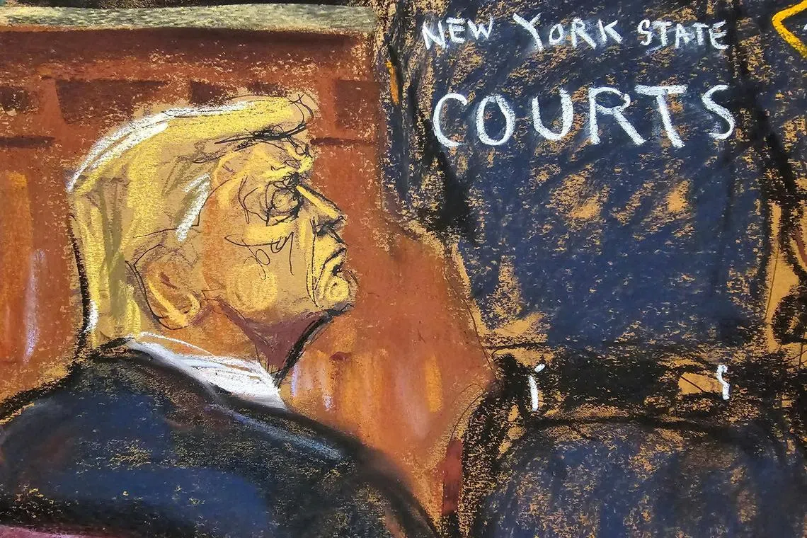 A courtroom sketch showing Donald Trump on May 30, 2024, as the verdict was read in his criminal trial on charges that he falsified business records to conceal money paid to silence porn star Stormy Daniels in 2016.