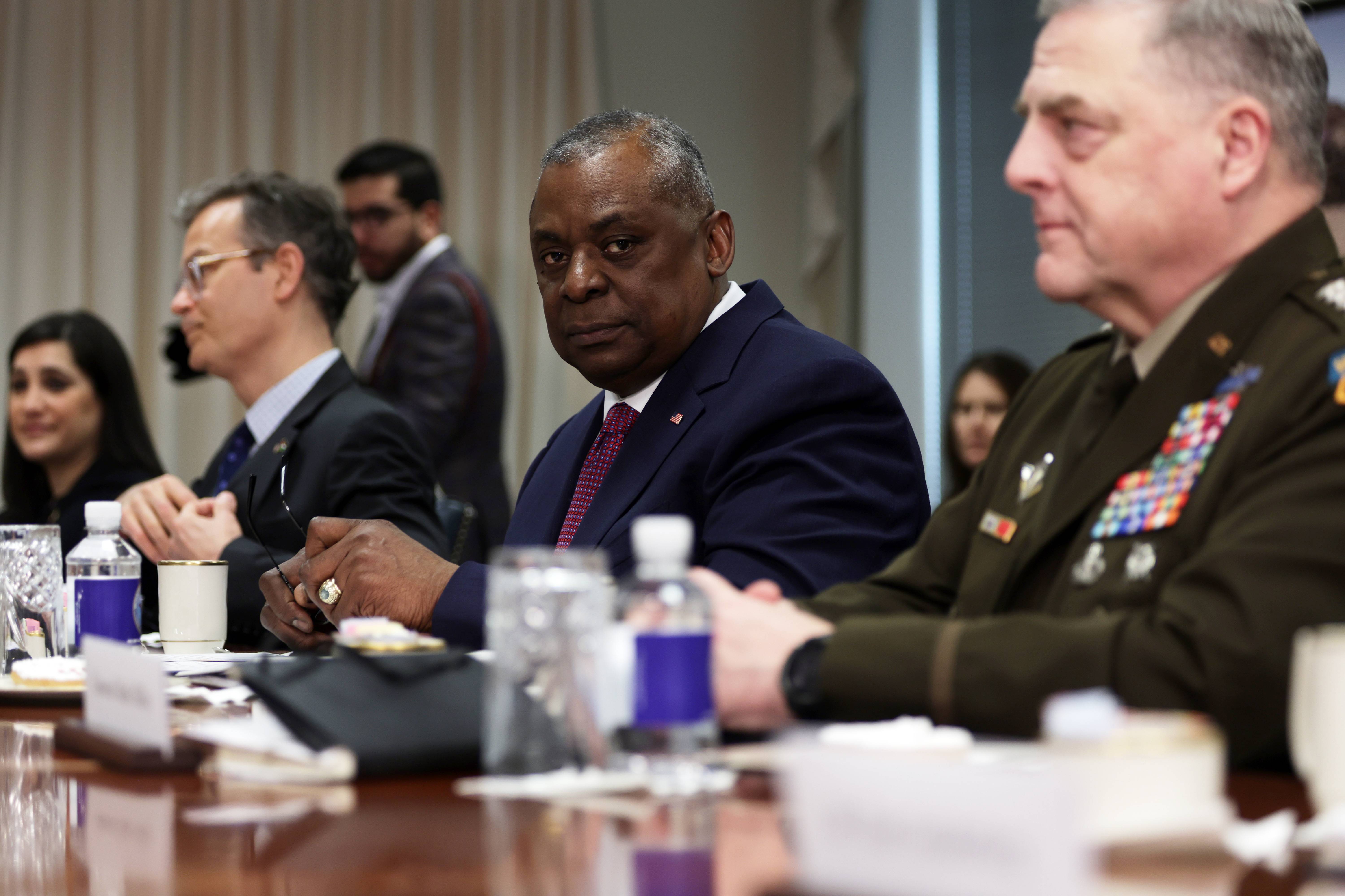 US Secretary of Defence Lloyd Austin (centre) is seen during a meeting with King Abdullah II of Jordan, at the Pentagon, on May 12, 2022.