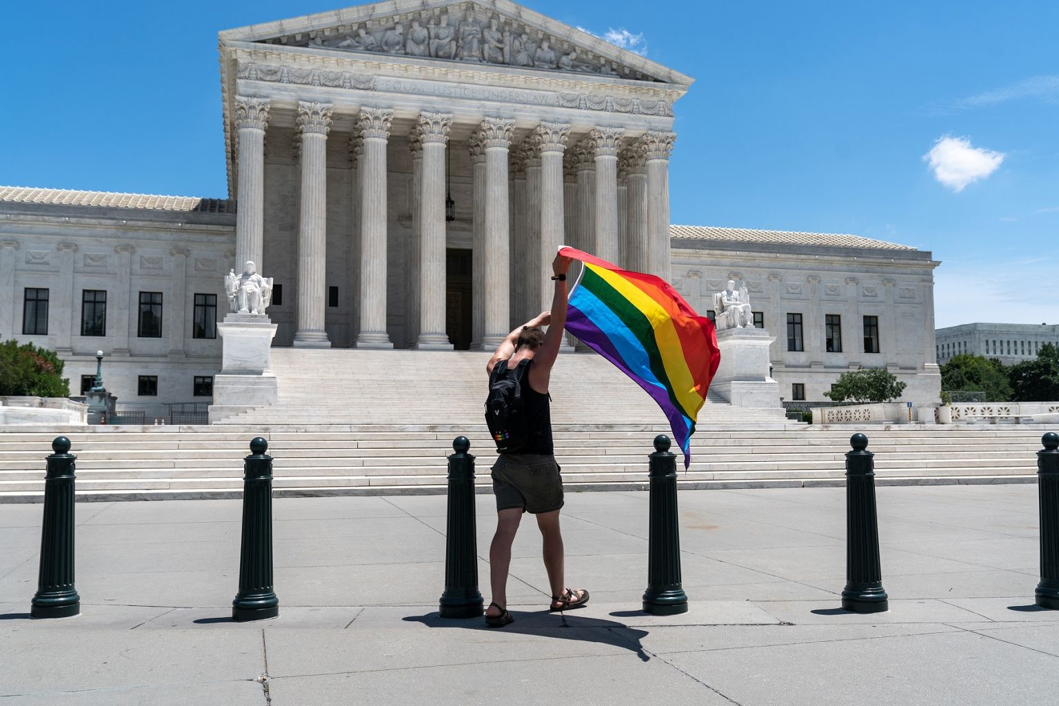 A person waves a pride flag in front of the Supreme Court in Washington in 2020.