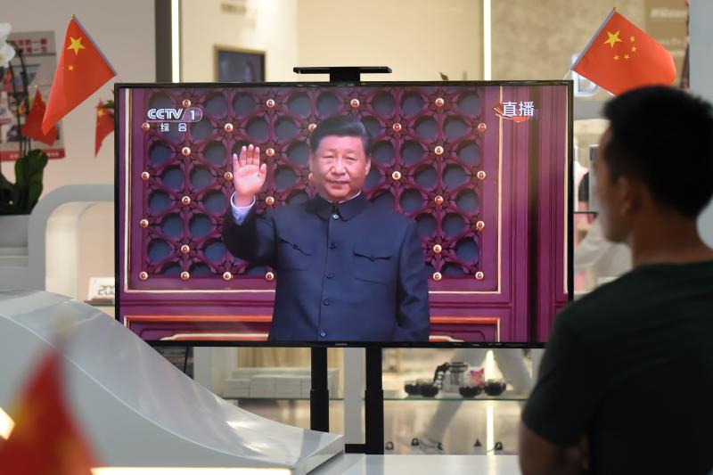 A photo taken on Oct 1, 2019, shows a repeat broadcast of a military parade at Tiananmen Square, to mark the 70th anniversary of the founding of the People's Republic of China, at a mall in Beijing.