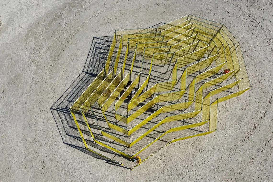 Another featured artwork is Chainlink, a nebulous maze-like structure constructed from yellow wire fencing.