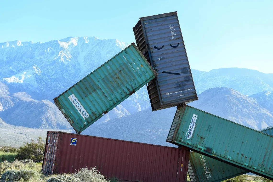 Also on display this year is Sleeping Figure, a haphazard-looking pile of discarded shipping containers that have been welded together to stick up out of the desert floor at improbable angles.
