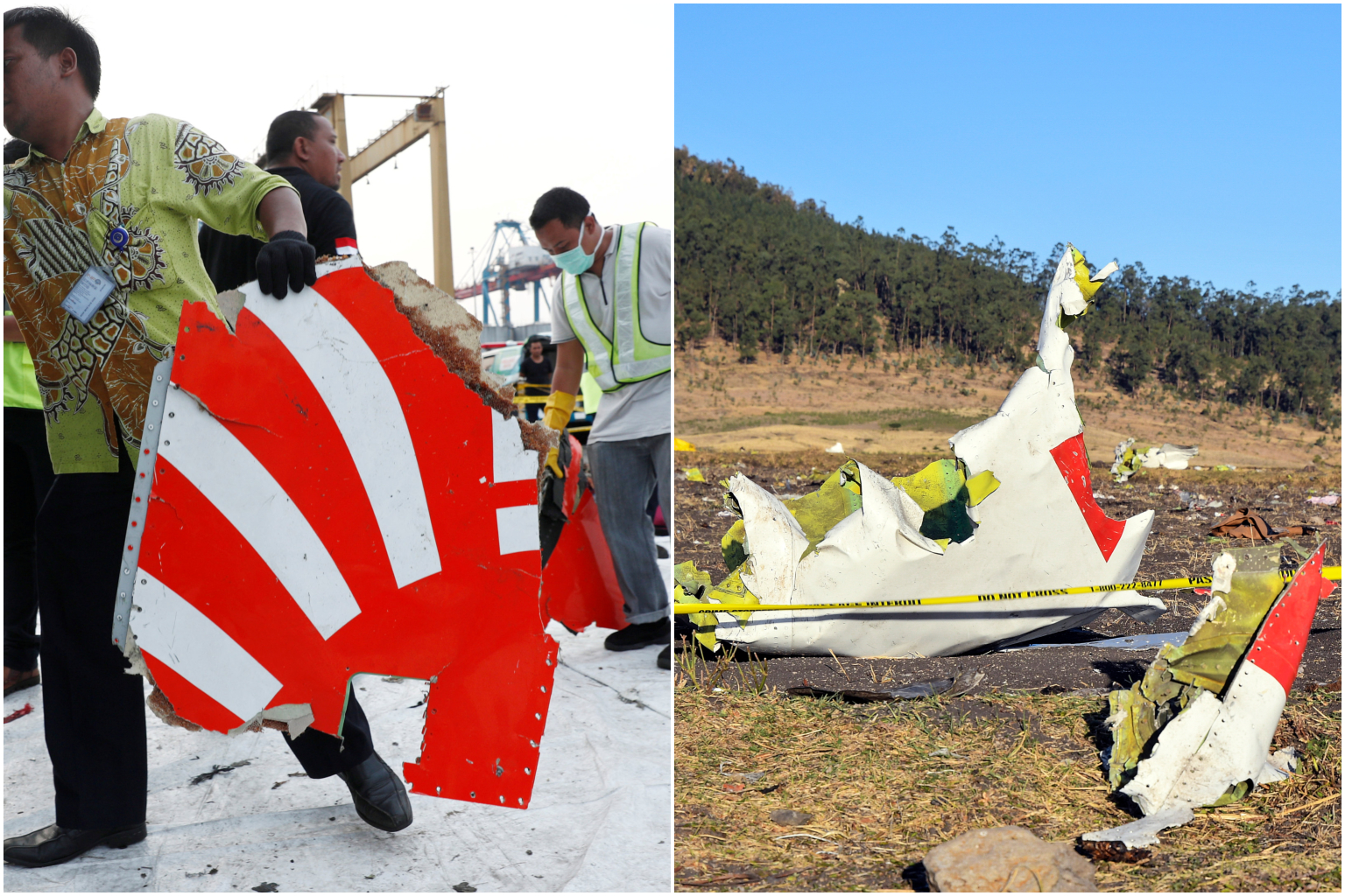 (Left) Workers loading up recovered debris believed to be from a Lion Air Boeing 737 that crashed in Indonesia in October 2018 and (right) wreckage at the crash site of Ethiopia Airlines Boeing 737 Max 8 on March 10, 2019.