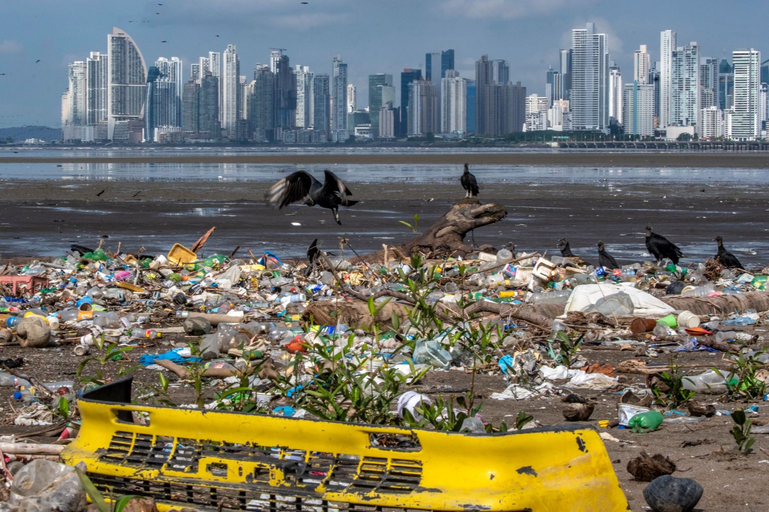 Vultures are seen over garbage, including plastic waste, on a beach in Panama City, on June 8, 2020, during the World Oceans Day.