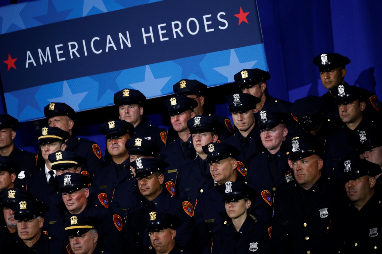 Police officers look on as US President Donald Trump delivers remarks about his proposed US government effort against the street gang Mara Salvatrucha.
