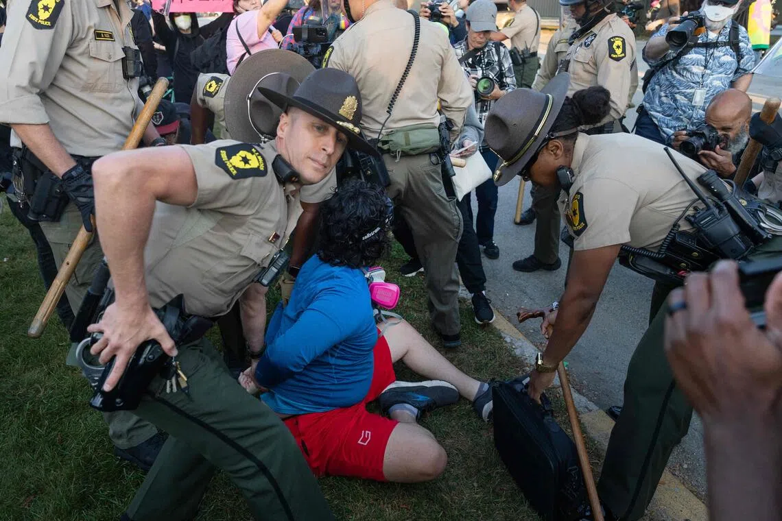Illinois State Police officers, some carrying rifles, night vision goggles and clubs, made several arrests, including of an elderly woman, who appeared to hyperventilate as she was shoved to the ground and handcuffed.