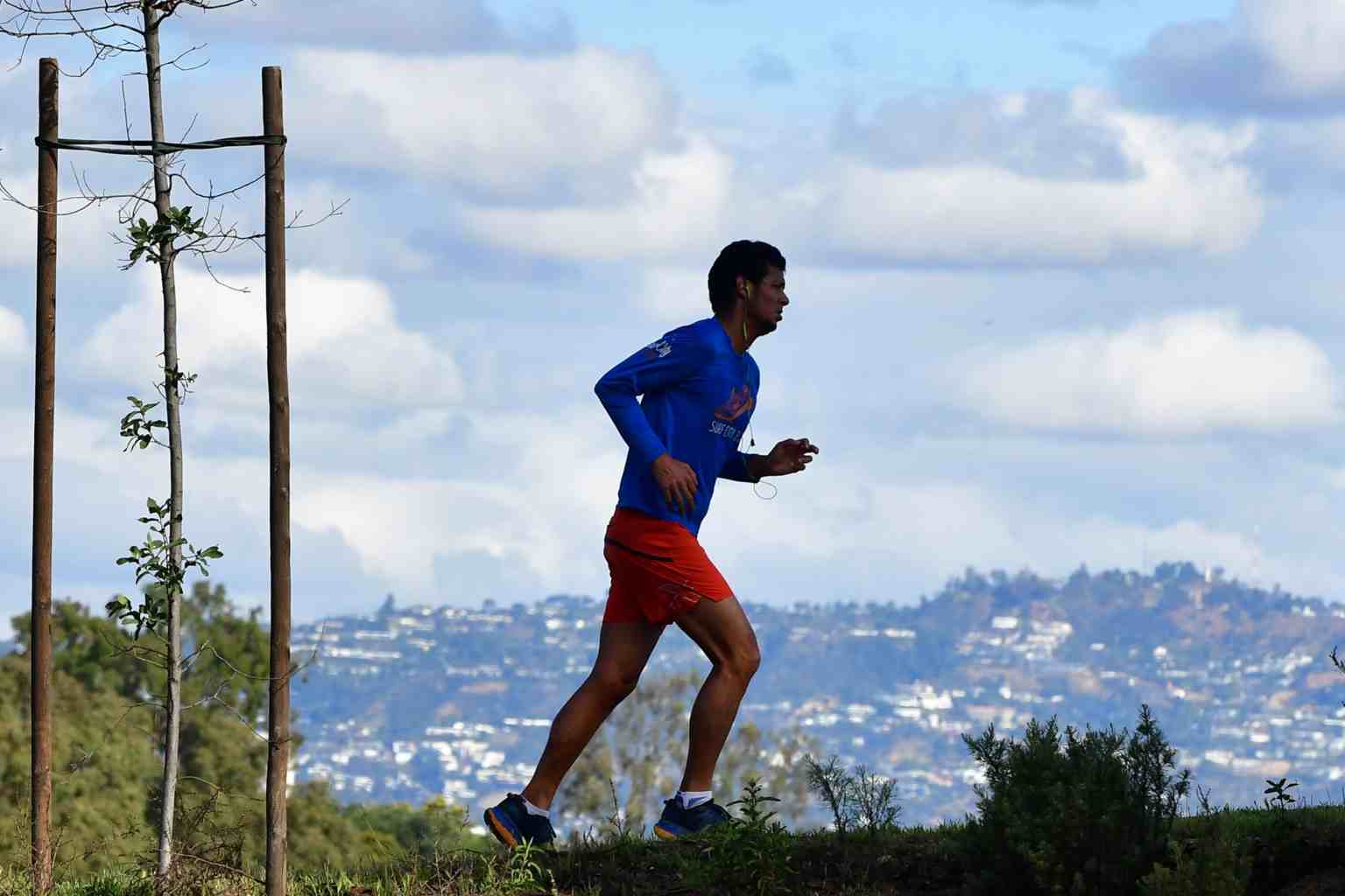 A man jogs at a Los Angeles state park on March 20, 2020, a day after the city announced a near-lockdown.