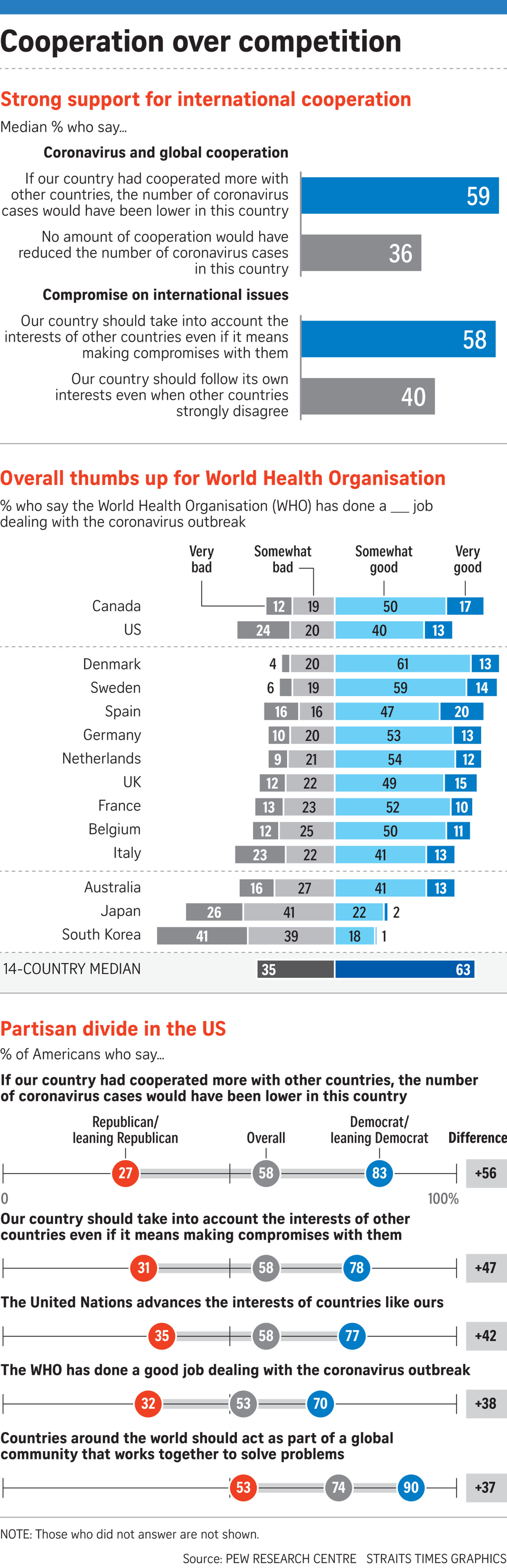 Some 59 per cent said greater international cooperation would have lowered Covid-19 case numbers at home, while 36 per cent said no amount of cooperation would have reduced the pandemic's impact in their country.