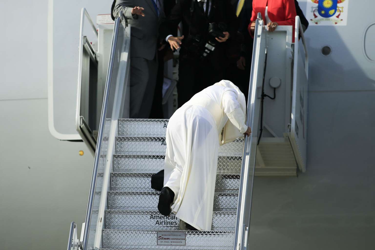 Following an arduous schedule in New York and Washington on the back of his four-day trip to Cuba, Francis stumbled several times as he climbed the stairs of the American Airlines jet taking him from JFK to Philadelphia.