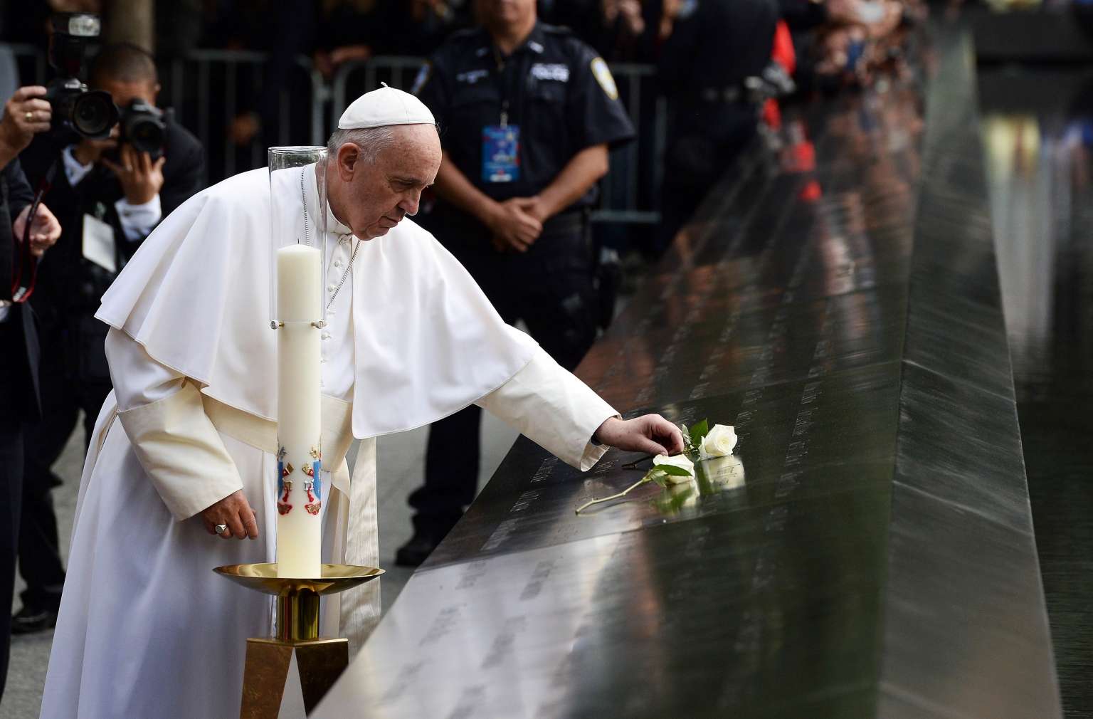 Pope Francis places a white rose on the names of the September 11 victims at the edge of the South Pool of the 9/11 memorial in New York.