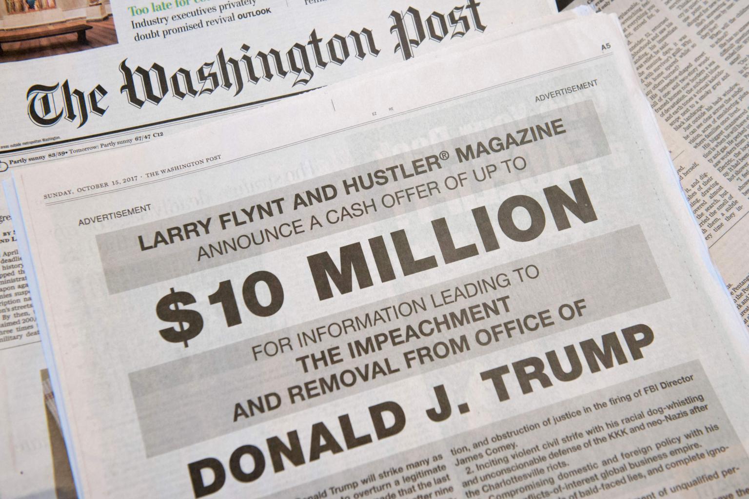 In 2017, Flynt offered US$10 million for dirt to help remove US president Donald Trump from office, running a full page ad in The Washington Post.