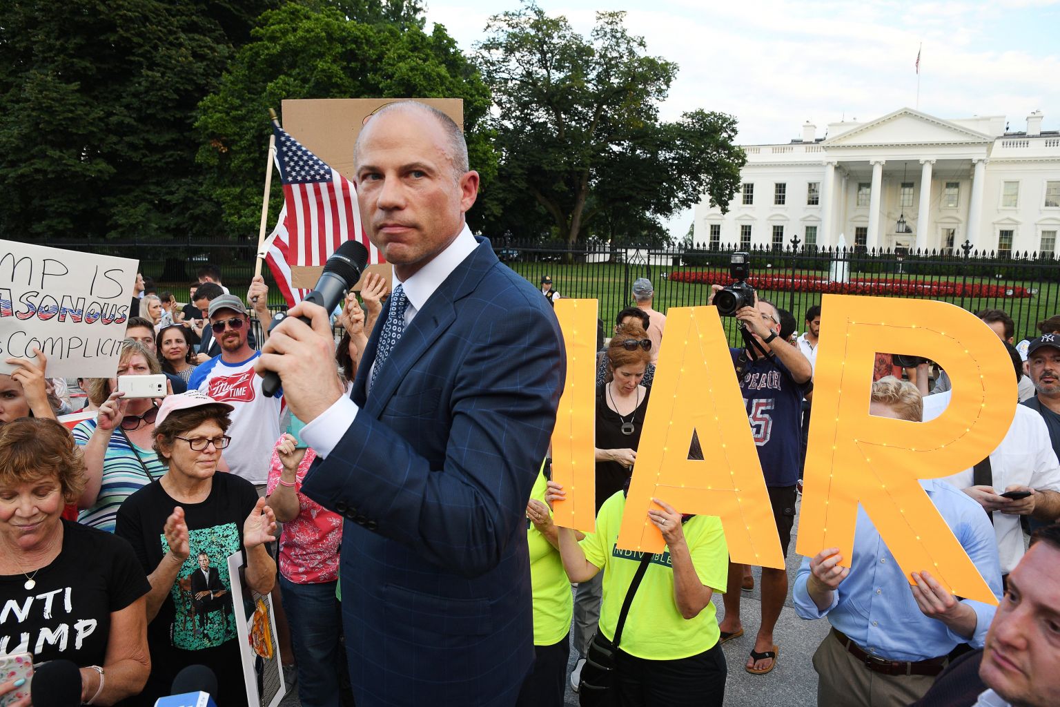 As protesters blew whistles and banged drums, Mr Avenatti and other speakers on Pennsylvania Avenue opposite the executive mansion's North Lawn focused on statements that President Donald Trump made at his summit with Vladimir Putin in Helsinki on Monday.