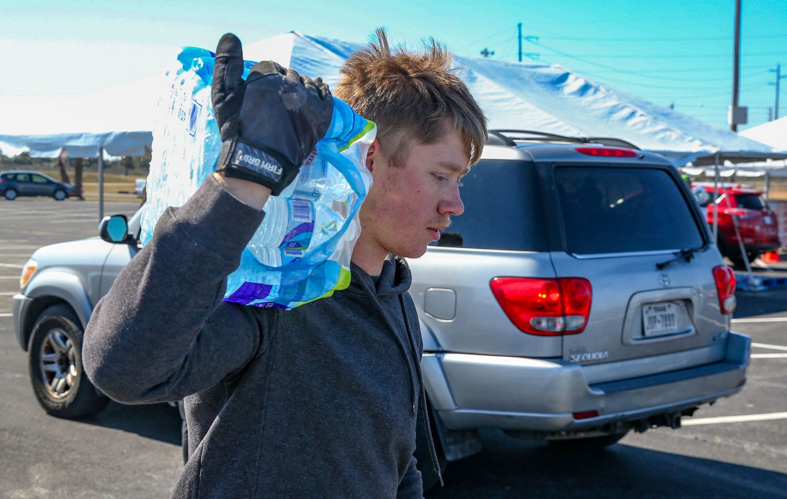Volunteers hand out cases of water to Galveston residents at a parking lot in Galveston, Texas.