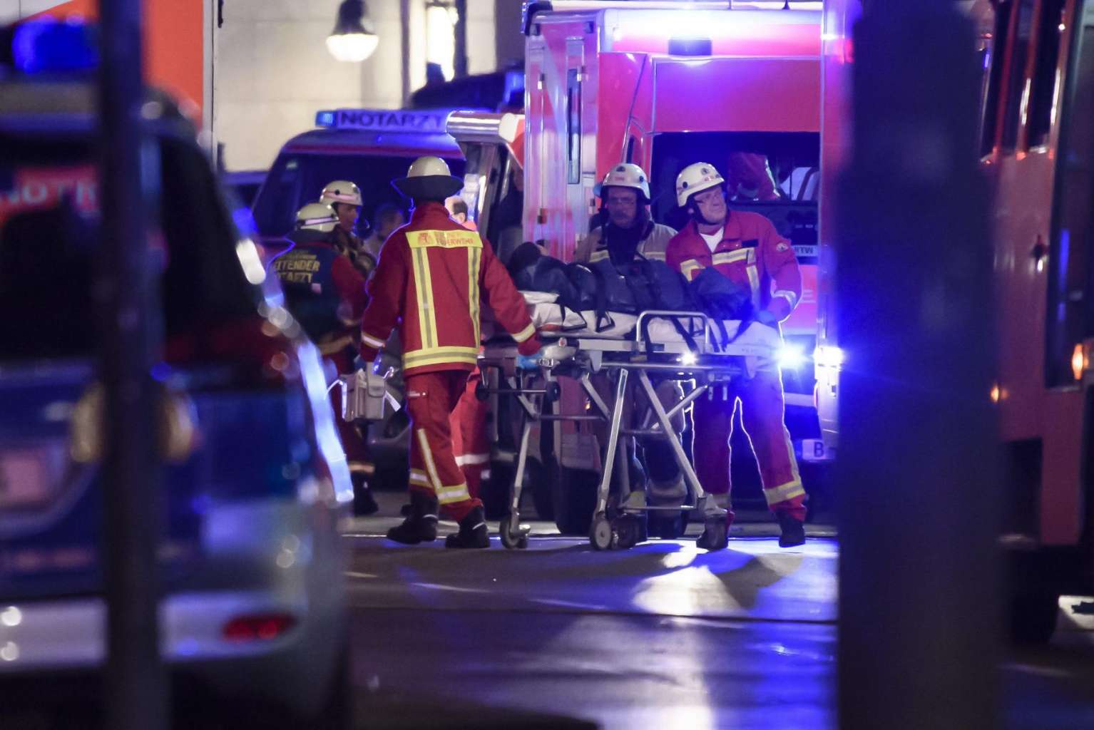 An injured person is carried on a stretcher by a firemen at the scene where a truck crashed into a Christmas market in Berlin.