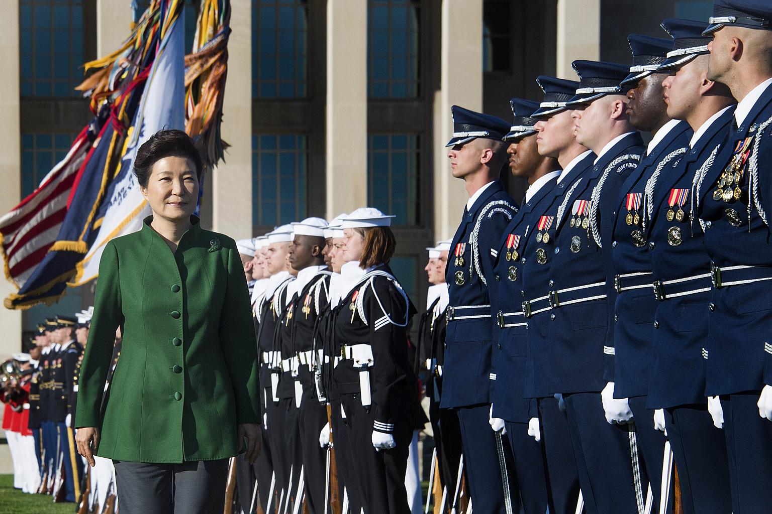 President of South Korea Park Geun Hye (left) participating in a full military honours parade at the Pentagon in Washington DC, on Oct 15, 2015.