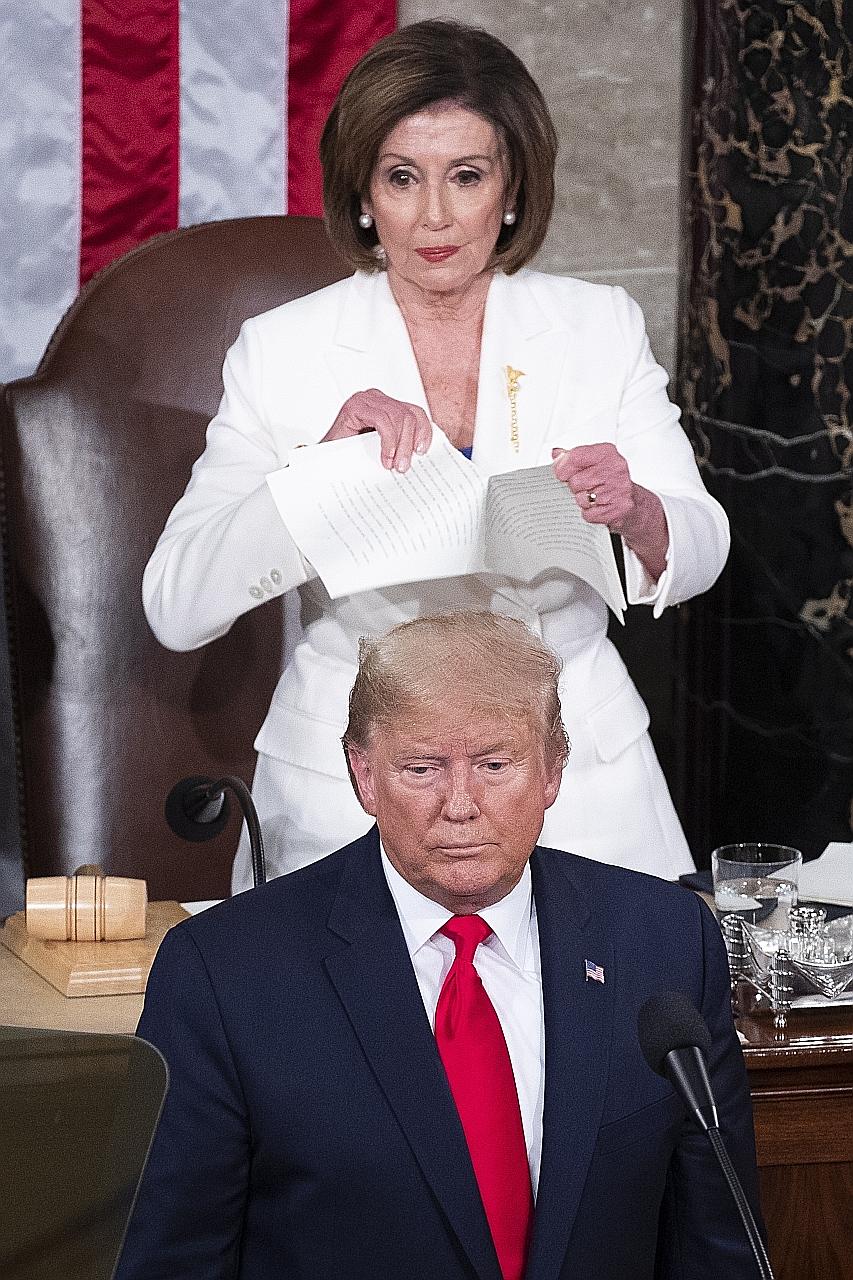At the end of his 80-minute speech, Ms Pelosi stood and ripped apart her copy of the remarks as millions watched on television. She later told reporters it was "the courteous thing to do, considering the alternative".