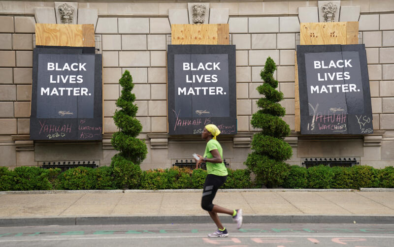 A jogger passes Black Lives Matter signs near the White House in Washington,on June 10, 2020.