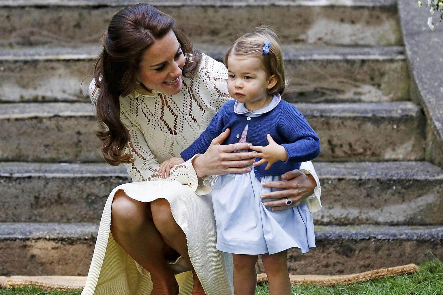 Britain's Catherine, Duchess of Cambridge, speaks to Princess Charlotte as they arrive at a children's party at Government House in Victoria, British Columbia, Canada, on Sept 29, 2016.