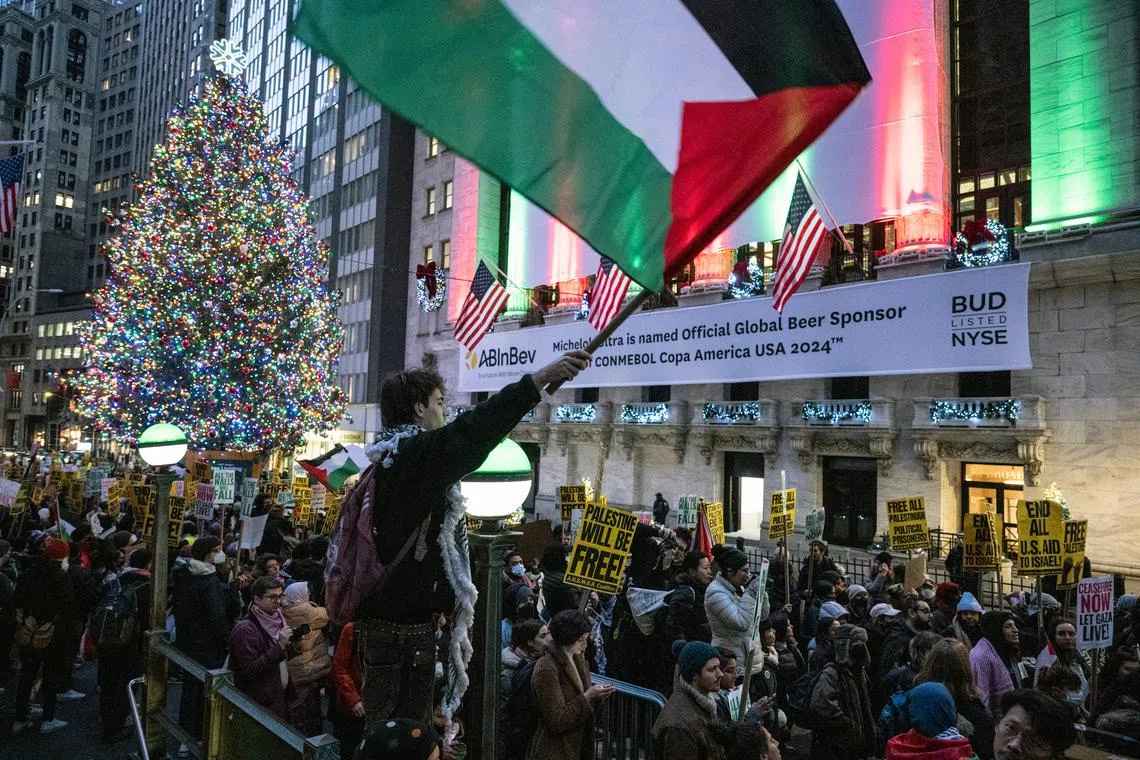 Protesters rally outside the New York Stock Exchange in lower Manhattan to call for a ceasefire in Gaza, on Dec 8.