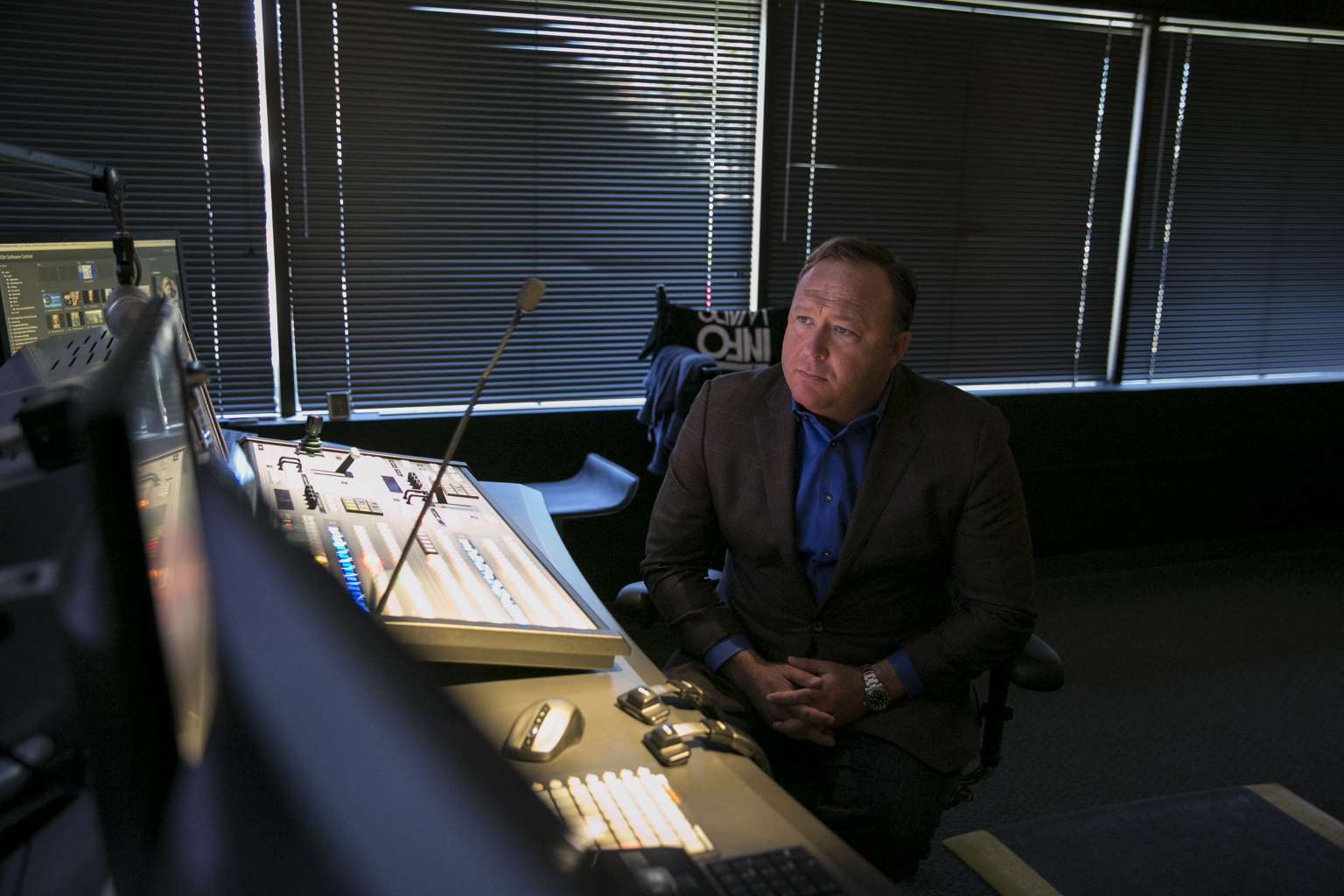 Prominent conspiracy theorist Alex Jones in the control room for his right-wing radio show, in Austin, Texas, on Feb 17, 2017.