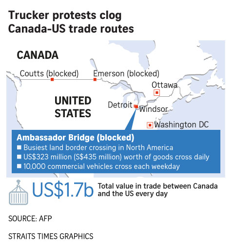 WINDSOR/WASHINGTON (REUTERS) - Protesters opposing Covid-19 pandemic restrictions flouted a court order and emergency rules, continuing to occupy a vital Canada-United States trade corridor early on Saturday (Feb 12), hours after a judge granted an injunction to end the blockade that has crippled North America's well-knit auto industry.