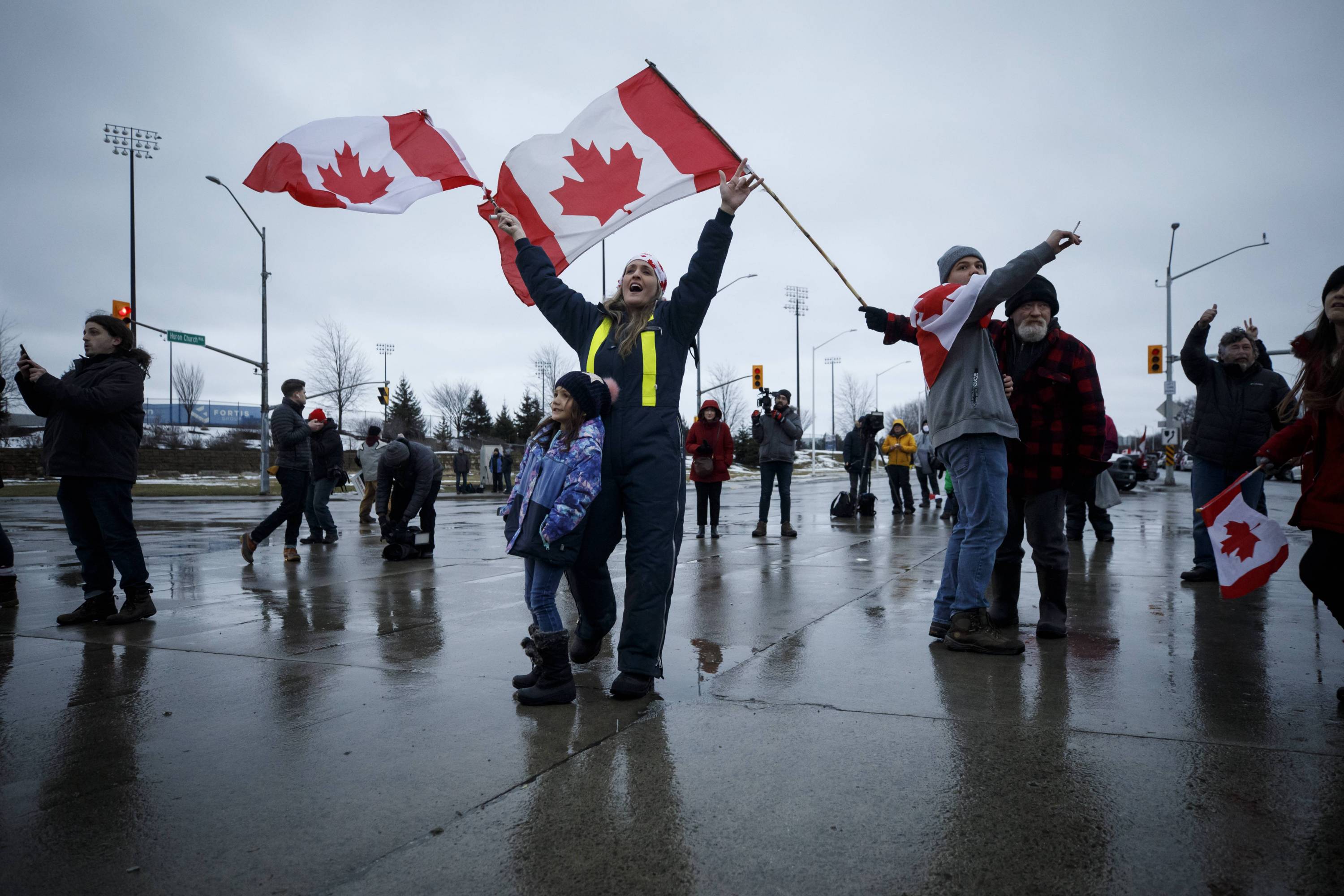 Protesters wave flags during a blockade at the foot of the Ambassador Bridge at the Canada-US border on Feb 11, 2022.