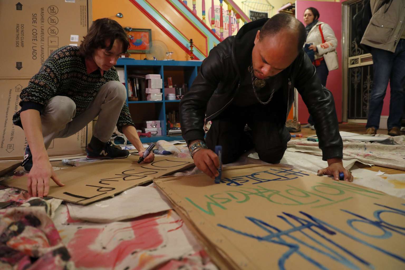 Activists, including David Thurston (right), gather to make signs for demonstrations against the upcoming inauguration of Donald Trump on Jan 11, 2017 in Washington, DC.