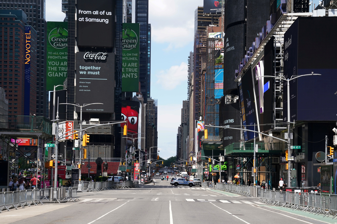 Times Square, one of the most famous gathering spots in the world, draws up to 450,000 people daily. The cascade of 27 ruby-red glass steps, which seats hundreds at a time, has been closed indefinitely. Dozens of theater-inspired signs remind visitors of social-distancing rules, including one that says, "Phantom of the Opera: popularizing masks since 1986."