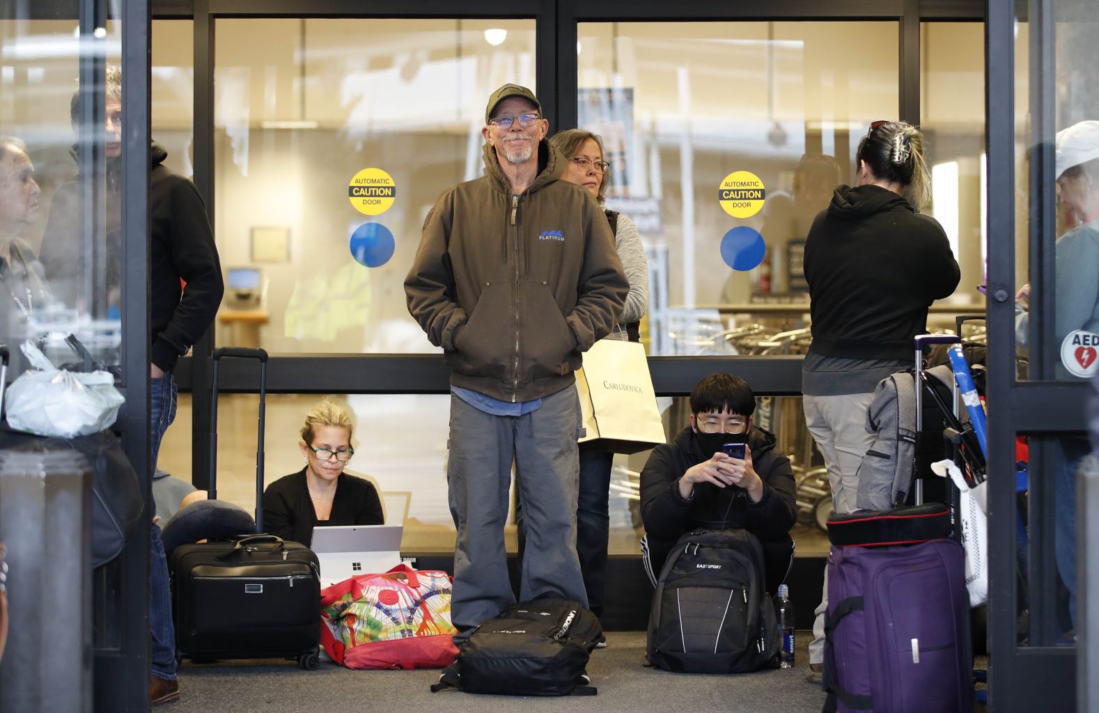 People wait outside in the cold after being evacuated from Salt Lake International Airport after an earthquake on March 18, 2020.