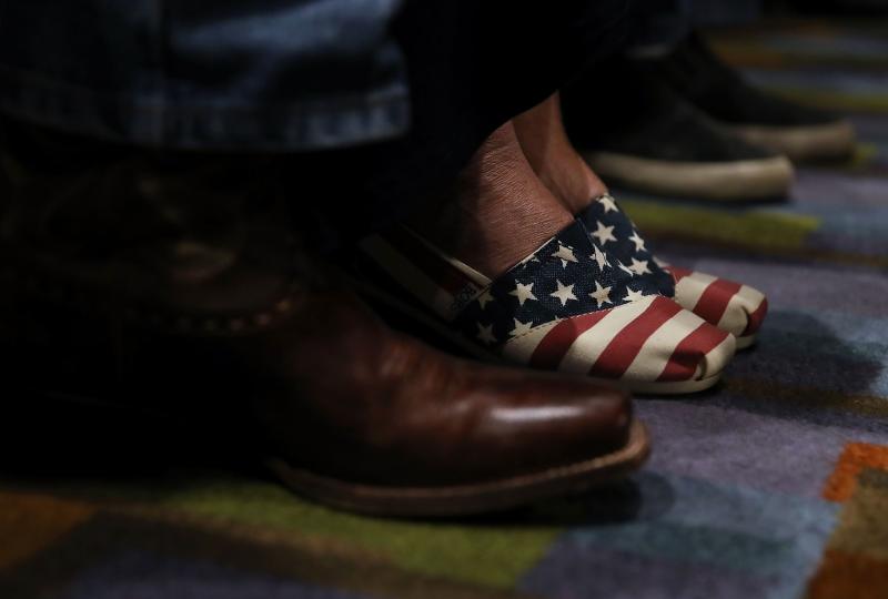 A supporter wears patriotic shoes as US Senator Ted Cruz speaks during a Get Out The Vote Bus Tour rally on Nov 3, 2018 in Corpus Christi, Texas.