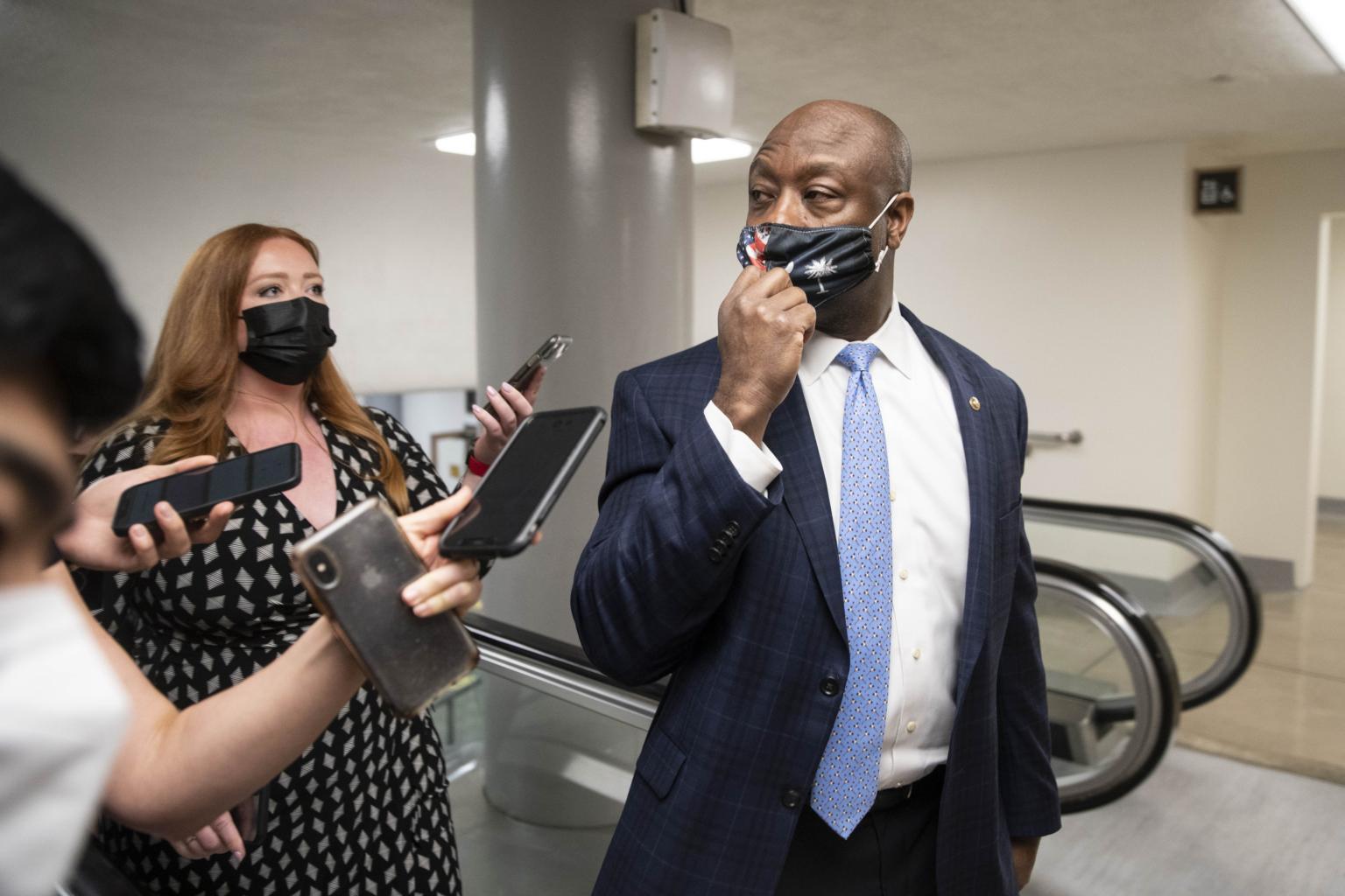Senator Tim Scott walks through the Senate subway at the US Capitol in Washington, on April 28, 2021.