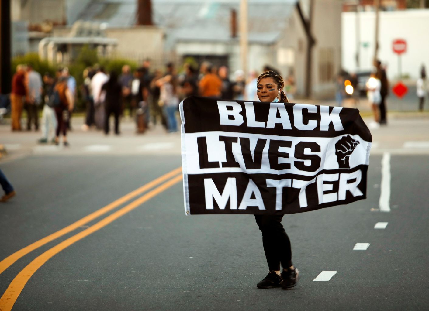 A protester carries a Black Lives Matter flag shortly before the start of a dawn to dusk curfew following the killing of Andrew Brown Jr by US sheriffs, in Elizabeth City, North Carolina, on April 27, 2021.