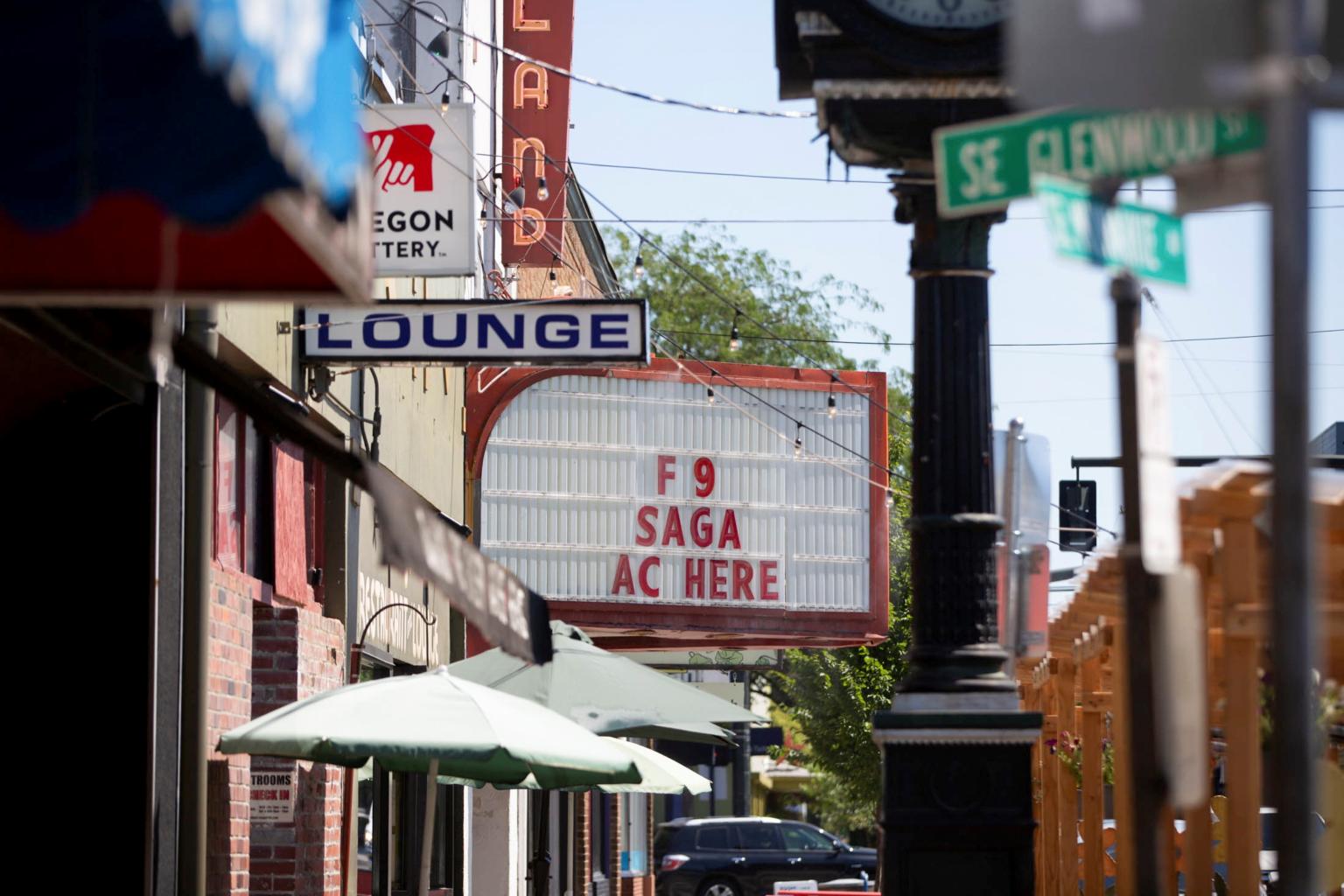 A movie theatre advertises air conditioning during unprecedented heat wave in Portland, Oregon on June 27, 2021.