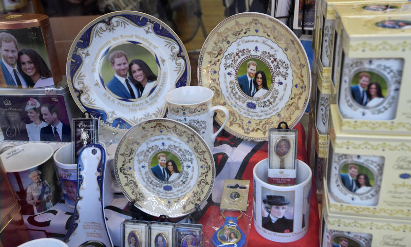 Souvenirs themed on the upcoming royal wedding between Britain's Prince Harry and actress Meghan Markle are seen on sale in Windsor, Britain, on May 8, 2018.