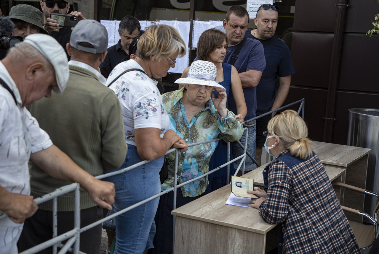 Residents standing in line for the registration of Russian citizenship and passport application, in Melitopol, Zaporizhia region, on July 14, 2022.