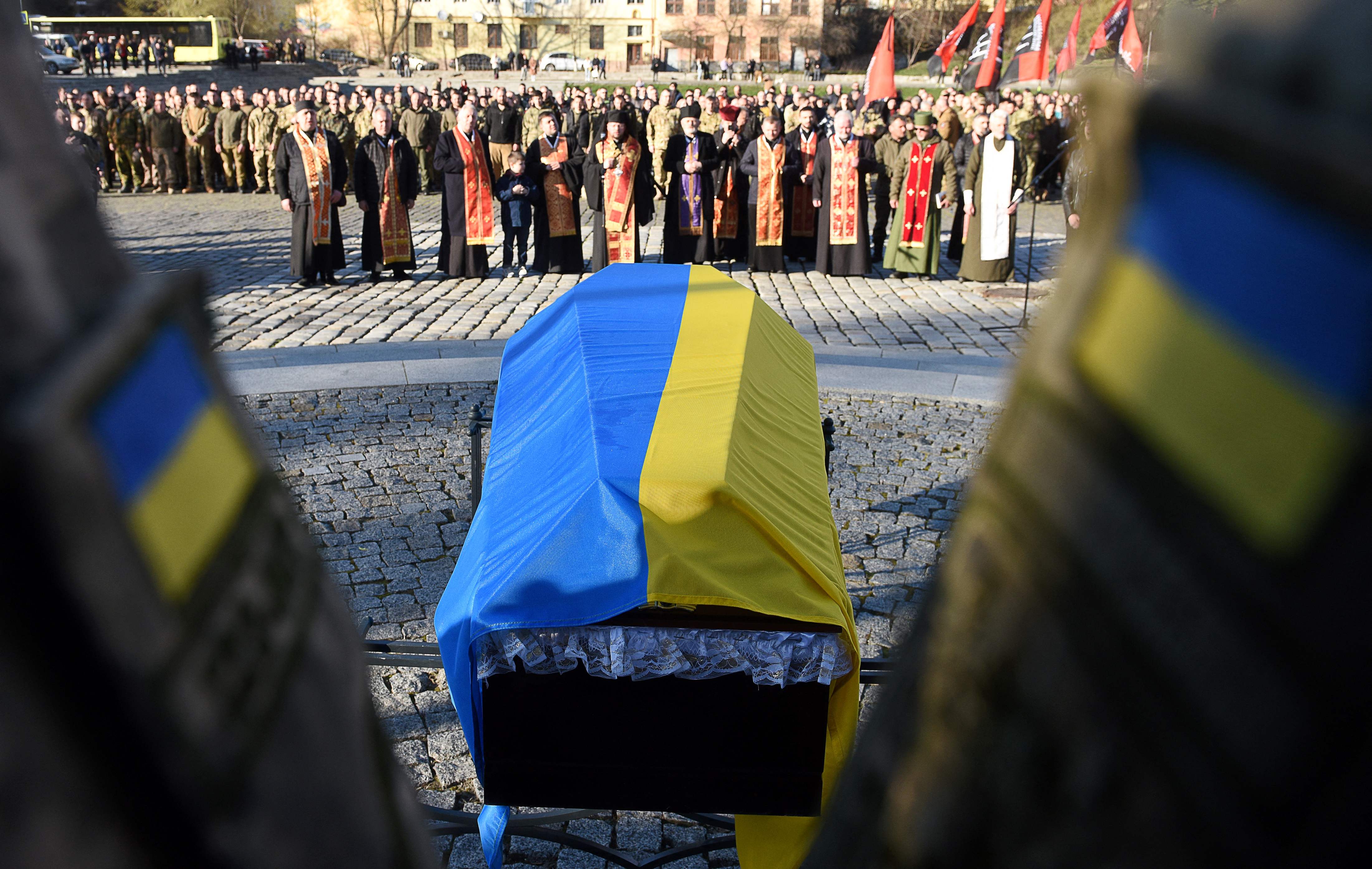 A funeral service is held in Lviv for a Ukrainian fighter who died amid Moscow's invasion of Ukraine, on April 13, 2022,