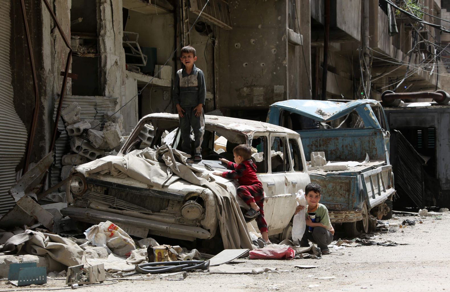 Syrian boys play on a destroyed car in the former rebel-held Syrian town of Douma on April 19, 2018.